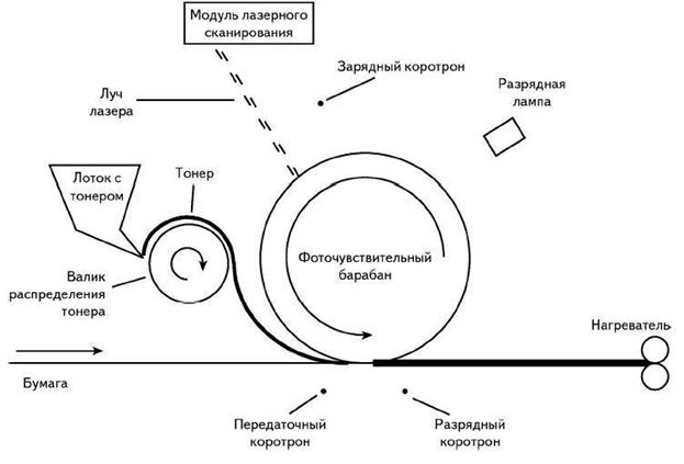 блок распределения тонера, коротроны, разрядную лампу, блок закрепления и механизм транспортировки бумаги. Чаще всего эти элементы конструктивно выполнены в виде одного модуля (аналогичное печатающее устройство используется в копировальных машинах).