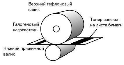 Итак, на листе бумаги "рассыпан'' тонер, представляющий некое изображение. Тонер имеет вид порошка, и даже небольшое воздействие может разрушить изображение. Для закрепления тонера на бумаге лист прокатывается между двумя валиками, нагретыми до 200°С (рис. 5). Такой нагрев приводит к плавлению частиц тонера и прилипанию к волокнам бумаги. Когда процесс печати завершен, лист бумаги "выползает" из принтера.