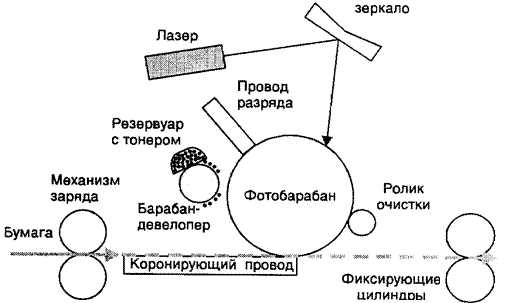 Важнейшим конструктивным элементом лазерного принтера является вращающийся фотобарабан, с помощью которого производится перенос изображения на бумагу. Фотобарабан представляет собой металлический цилиндр, покрытый тонкой пленкой из фотопроводящего полупроводника. По поверхности барабана равномерно распределяется электрический заряд. С помощью тонкой проволоки или сетки, называемой коронирующим проводом. На этот провод подается высокое напряжение, вызывающее возникновение вокруг него светящейся ионизированной области, называемой короной.