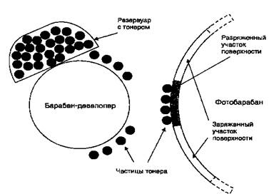На следующем рабочем шаге с помощью другого барабана, называемого девелопером (developer), на фотобарабан наносится тонер — мельчайшая красящая пыль. Под действием статического заряда мелкие частицы тонера легко притягиваются к поверхности барабана в точках, подвергшихся экспозиции, и формируют на нем изображение (рис. 2.3).