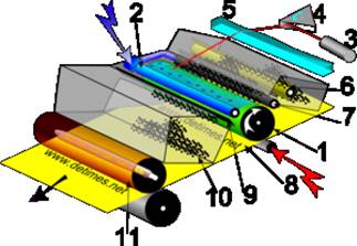 Лазер, управляемый микроконтроллером, генерирует тонкий световой луч, отражающийся от вращающегося зеркала. Этот луч, попадая на фотобарабан, засвечивает на нем точки, и в результате в этих точках изменяется электрический заряд.