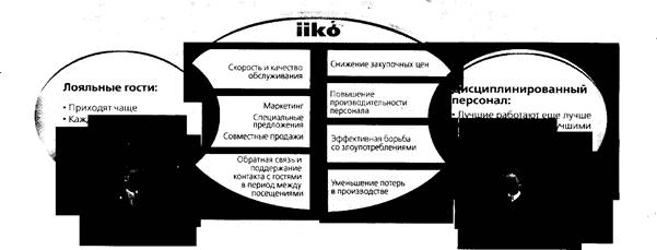 Всем этим требованиям удовлетворяет отечественная система автоматизации ресторанного бизнеса «Iiko» (айко). В отличие от других отечественных систем, «Iiko» полностью управляет всеми процессами в ресторане: автоматизирует продажи и склад; ежеминутно контролирует персонал и поставщиков; проверяет аппаратуру; привлекает новых и удерживает старых клиентов (рис.1).