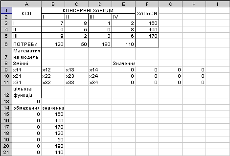 Розв'язок задач лінійного програмування. Транспортна задача. Мета роботи: Набути навичок складання математичної моделі транспортної задачі та її реалізації з використанням табличного процесору Excel Задача: Чотири консервних заводи для виробництва продукції використовують сировину, яка надходить із трьох КСП.На кожен завод підприємств сировина може завозитися з будь-якого КСП. Потреби в сировині кожного із заводів,запаси сировини та тарифи перевезень наведені у таблиці. Скласти такий план перевезень, при якому загальна вартість перевезень є мінімальною.