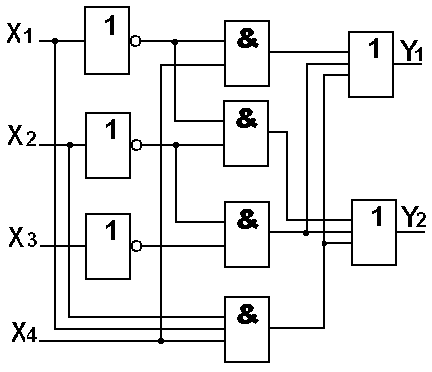Припустимо пристрій реалізує дві логічні функції – Y1 і Y2 , що подані картами рис. 2. Необхідно синтезувати мінімальну схему логічного пристрою в булевому базисі.