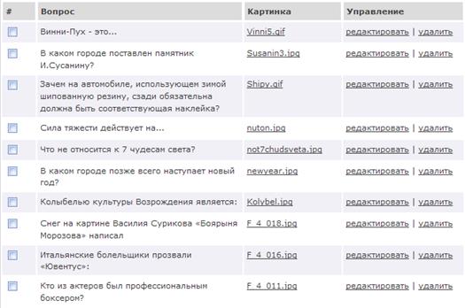 Для адміністрування тестом необхідно обрати пункт меню «Тесты». В цьому пункті можна додавати/видаляти/редагувати запитання і відповіді. На рисунку 3.17 наведений список питань.
