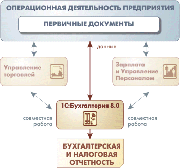 «1С: Бухгалтерия 8.0» обеспечивает решение всех задач, стоящих перед бухгалтерской службой предприятия, если бухгалтерская служба полностью отвечает за учет на предприятии, включая, например, выписку первичных документов, учет продаж и т.д. Кроме того, информацию об отдельных видах деятельности, торговых и производственных операциях, могут вводить сотрудники смежных служб предприятия, не являющиеся бухгалтерами. В последнем случае за бухгалтерской службой остается методическое руководство и контроль за настройками информационной базы, обеспечивающими автоматическое отражение документов в бухгалтерском и налоговом учете.