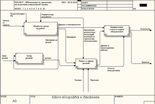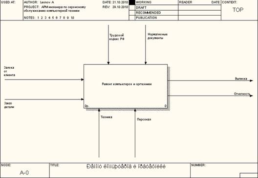 На рисунке 2 изображена контекстная диаграмма работы «Автоматизированное рабочее место инженера по обслуживанию компьютерной техники».