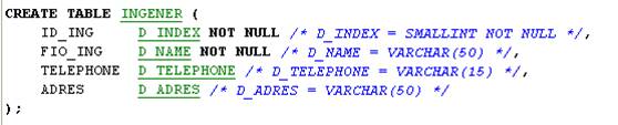 | ingener | ID_ING | smallint | + | + | D_INDEX | |