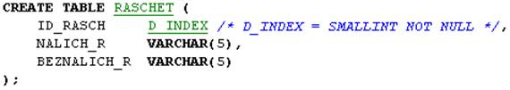 | raschet | Id_rasch | smallint | + | + | D_INDEX | |