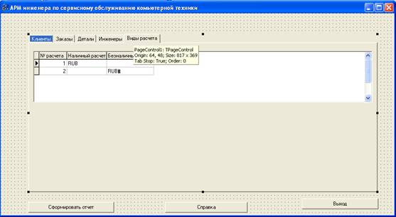 База данных состоит из таблиц, хранящих информацию о следующих объектах – клиенты, заказы, инженеры, детали, виды расчета.