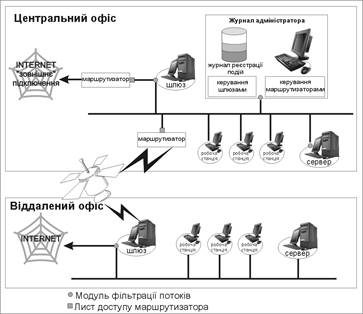 · Далі, за допомогою введених понять описується політика розмежування доступу в наступних термінах: “Групі користувачів А дозволений доступ до ресурсу Б з допомогою сервісу чи протоколу 3, але при цьому необхідно зробити позначку в реєстраційному журналі”. Сукупність таких записів компілюється в здійсненну форму блоком керування і далі передається на виконання в модулі фільтрації.