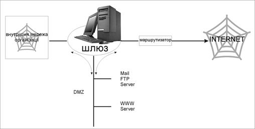 Нехай ми вирішили установити в себе в організації кілька загальнодоступних серверів для надання інформаційних послуг. Це можуть бути, наприклад, сервери World Wide Web, FTP чи інші інформаційні сервери. Оскільки такі системи відособлені від роботи всієї іншої мережі організації, для них часто виділяють свою власну підмережу, що має вихід у Internet через шлюз (мал. 6).