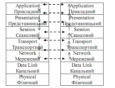 Рис. 1 Еталонна модель взаємодії ISO/OSI.
