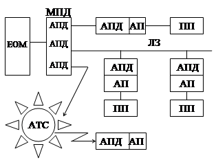 Абонентські ЕОМ взаємодіють з АП через АПД. Мультиплексом передачі даних (МПД) забезпечує підключення до основної ЕОМ певної кількості абонентських систем, який містить засоби для обміну даними між ЕОМ та підсистемою передачі даних. Всі функції систем телеобробки забезпечуються відповідними програмними засобами.