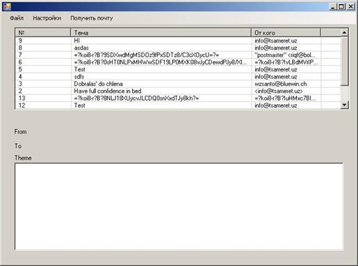 Вверху окна расположены кнопки главного меню (рис. 3.5.1). Ниже расположено поле, в которое загружается список полученных писем. В самое нижнее поле загружается текст письма.