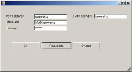 Класс FormSettings обеспечивает интерфейс окна настроек почтового ящика, а также обеспечивает сохранение этих настроек в файл профиля.