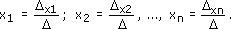 4. Если главный определитель системы не равен нулю, то выполняют пункт 5. Иначе рассматривают вопрос о разрешимости данной системы (имеет бесчисленное множество решений или не имеет решений). Находят значения всех неизвестных по формулам Крамера для решения системы n линейных уравнений с n неизвестными, которые имеют вид:
