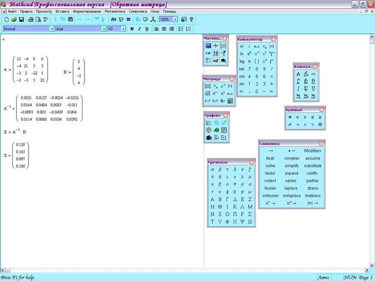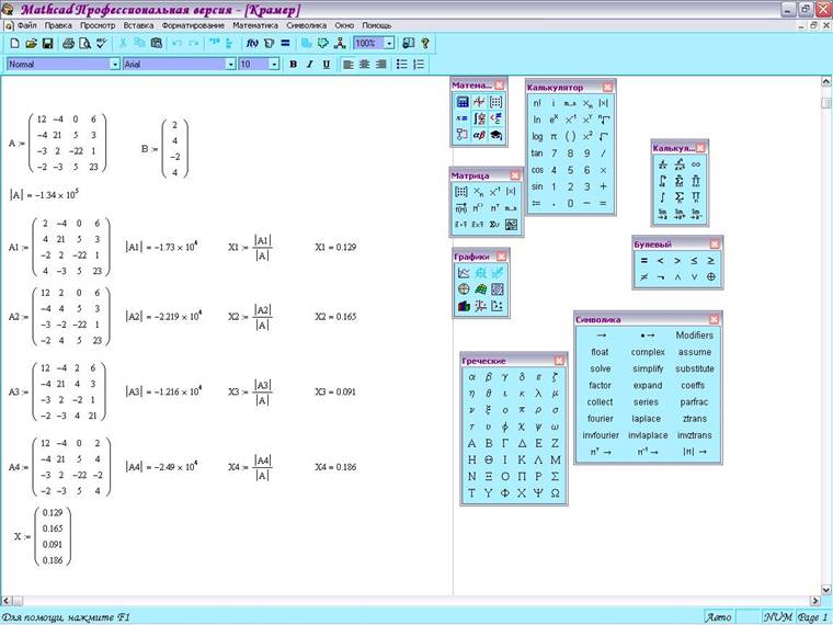 Microsoft Office Excel . Если же говорить о программе Excel, которая является одной из наиболее известных в обработке электронных таблиц, то без преувеличения можно утверждать, что ее возможности практически неисчерпаемы.Обработка текста, управление базами данных - программа настолько мощна, что во многих случаях превосходит специализированные программы - редакторы или программы баз данных. Такое многообразие функций может поначалу запутать, нежели заставить применять их на практике. Но по мере приобретения опыта начинаешь по достоинству ценить то, что границ возможностей Excel тяжело достичь.За всю историю табличных расчетов с применением персональных компьютеров требования пользователей к подобным программам существенно изменились. В начале основной акцент в такой программе, как, например, Visi Calc , ставился на счетные функции. Сегодня, положение другое. Наряду с инженерными и бухгалтерскими расчетами организация и графическое изображение данных приобретают все возрастающее значение. Кроме того, многообразие функций, предлагаемое такой расчетной и графической программой, не должно осложнять работу пользователя. Программы для Windows создают для этого идеальные предпосылки.В последнее время многие как раз перешли на использование Windows в качестве своей пользовательской среды. Как следствие, многие фирмы, создающие программное обеспечение, начали предлагать большое количество программ для Windows.Visual Basic . MicrosoftVisualBasic – это мощная система программирования, позволяющая быстро и эффективно создавать приложения для MicrosoftWindows. В отличие от Excel и MathCADэто наиболее удобная программа для решения систем линейных уравнений. Простой пользовательский интерфейс, позволяющий легко переключаться с проекта формы на сам код программы.