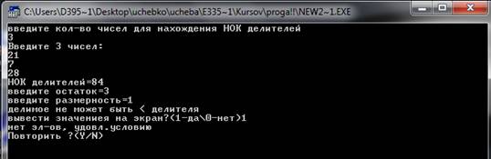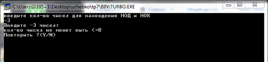 делителя и остатка на отриц-сть} begin write ('делитель или остаток не могут быть<0 '); end else begin if i>k then {проверка на делитель>остатка} begin write ('введите размерность='); readln(R); if R<=0 then begin writeln ('некорректная размерность '); readln; end else begin if R=1 then begin a:=1; b:=9; end else begin a:=pow(10,(R-1)); {инициализация верх и нижн границ} b:=pow(10,R); b:=b-1; end; end; if b<i then {проверка на делимое>делителя} writeln ('делиоме не может быть < делителя ') else begin SUM:=0; {обнуление сумы кол-ва эл-ов} for D:= a to b do begin if (D mod i)=k then {проверка эл-ов на условие} begin SUM:=SUM+1; end; end; writeln; writeln ('кол-во эл-ов с делителем=', i:3, ' и остатком=', k:3, ' равно', SUM:6); end; {b<i} end {if i>k} else write ('остаток не может быть > делителя '); end; {if otriz} {\\\\\\\\\\\\\\\\\\\\\\\\\\\\\\\\\} write ('вывести значения на экран?(1-да\0-нет)'); readln(S); if S=1 then if SUM=0 then writeln('нет эл-ов, удовл. условию') else begin for D:= a to b do if (D mod i)=k then begin write(' ',D:4); {вычисление кол-ва делителей и их мн-ва} for i:= 1 to n do begin write(numb[i], ' ^ ', powers[i]); k:=k*((pow(numb[i],powers[i]+1) - 1) div (numb[i] - 1)); t:=t*(powers[i]+1); {кол-во делителей} if i <> n then write(' * '); end; writeln; writeln('кол-во множителей: tau(num)=',t); writeln('сумма множителей: sigma(num)=',k); writeln('Повторить ?(Y/N)'); q:=ReadKey; until q in ['N','n']; clrscr; end;{Factor} {----------------------------------------} procedure NodNok; type TArray=array [1..200] of integer; var a,b:TArray; i,l,j,maxa,minj,maxj:longint; k,d:longint; n:integer; q:char; begin repeat clrscr; writeln('введите ко-во чисел для нахождения НОД и НОК'); readln(n); writeln('введите ',n,' чисел: '); if n<=0 then writeln(‘кол-во чисел не может быть<=0’) else begin readln(a[1]); b[1]:=a[1]; maxa:=a[1]; for i:=2 to n do begin readln(a[i]); b[i]:=a[i]; if a[i]>maxa then maxa:=a[i]; end; i:=1; while (a[i]=0) and (i<=n) do inc(i); if i=n+1 then writeln('НОД – любое число') else begin for j:=1 to n do if a[j]=0 then a[j]:=a[i]; k:=1; for i:=2 to maxa do begin minj:=1000; for l:=1 to n do begin j:=0; while (a[l] mod i=0) do begin a[l]:=a[l] div i; inc(j); end; if (j<minj) then minj:=j; end; if (minj<>0) then for l:=1 to minj do k:=k*i; end; vecb[k]:=-j; k:=k+1; end; end; a:=1; for j:=1 to abs(vec[1]) do begin if (vec[1] mod j)=0 then begin veca[a]:=j; a:=a+1; { veca[a]:=-j; a:=a+1;} End; end; b:=a; for j:=1 to k-1 do Begin for a:=1 to b-1 do Begin Begin c:=i; sum:=0; for i:=1 to c do Begin sum:=sum+vec[i]*pow1(vecb[j]/veca[a],c-i); if (sum<0.00001) and (sum>-0.00001) then if vec[a]=1 then writeln('ответ:',round(vecb[j])) else writeln('ответ:',round(vecb[j]), '/',round(veca[a])); end; End; End; End; end; readln; end;{SuperGorner} {----------------------------------------} procedure Express; var a,b,t:integer; q:char; begin repeat writeln('введите числитель='); readln(a); writeln('введите знаменатель='); readln(b); if b=0 then writeln(‘знаменатель не может быть=0’) else begin write('['); while (a mod b>0) do begin write(a div b,','); a:=a mod b; t:=b; b:=a; a:=t; end; write(a div b, ']'); end; writeln(‘Повторить ?(Y/N)'); q:=ReadKey; until q in ['N','n']; clrscr; end;{Express} {----------------------------------------} case k of 1:DelOstatok; 2:Factor; 3:NodNok; 4:SuperGorner; 5:Express; 6:AntiExp; else writeln ('нет операции'); end;{case} writeln('Повторить выполнение калькулятора ?(Y/N)'); q:=ReadKey; until q in ['N','n']; clrscr; readln; end.{prog} |