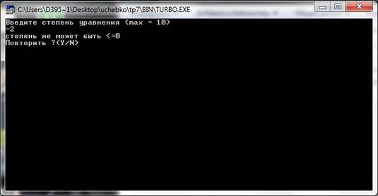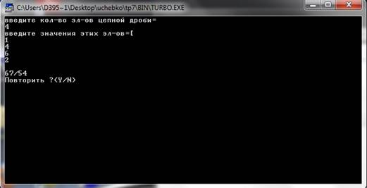 program kurs; uses crt; function pow(a,x:longint):longint; var t,i:longint; begin t:=a; for i:=1 to x-1 do t:=t*a; pow:=t; end; {pow} {----------------------------------------} procedure DelOstatok; var dd:array [1..200] of integer; R:integer; {размерность чисел} i:longint; {делитель} k:longint; {остаток} D,a,b:longint; {элементы заданного множества} SUM:longint; {кол-во эл-ов, удовл условию} S,T:byte; q:char; e,j,l,n:integer; maxa,minj,maxj:longint; begin repeat begin writeln('введите ко-во чисел для нахождения НОК делителей'); readln(n); writeln('введите ',n,' чисел: '); readln(dd[1]); maxa:=dd[1]; for i:=2 to n do begin readln(dd[i]); if dd[i]>maxa then maxa:=dd[i]; end; i:=1;while (dd[i]<>0) and (i<=n) do inc(i); if i<>n+1 then writeln('НОК не сущ-ет') else begin e:=1; for i:=2 to maxa do begin maxj:=0; for l:=1 to n do begin j:=0; while (dd[l] mod i=0) do begin dd[l]:=dd[l] div i; inc(j); end; if (j>maxj) then maxj:=j; end; if (maxj<>0) then for l:=1 to maxj do e:=e*i; end; writeln('НОК делителей=',e); end; end; i:=e; write ('введите остаток='); readln(k); if ((i<=0) or (k<0)) then {проверка {вывод эл-ов на экран} end; writeln; end; writeln('Повторить ?(Y/N)'); q:=ReadKey; until q in ['N','n']; clrscr; end; {DelOstatok} {----------------------------------------} procedure Factor; var numb, powers: array [1..100] of longint; c:longint; n:longint; n1,H:longint; i:longint; k,t: longint; q:char; begin repeat write('Введите число='); readln(c); if c<=0 then {проверка на корр числа} begin writeln('число должно быть>0'); readln; exit; end else {вывод мн-ва делителей} begin write('мн-во делителей: D(num)='); for H:= 1 to c do if c mod H=0 then write(H,' '); end; {конец вывода делителей} n:= 1; n1:= 0; while c <> 1 do begin i:= 2; while c mod i <> 0 do {проверка на делимостьс/без остатка} Inc(i); Inc(n1); if n1 = 1 then begin numb[n]:= i; powers[n]:= 1; end else if numb[n] = i then Inc(powers[n]) else begin Inc(n); {увеличение кол-ва простых множителей} numb[n]:= i; powers[n]:= 1; end; {while} c:= c div i; {деление числа на простой множитель} end; {while} {\\\\\\\\\\\\\\\\\\\\\\\\\\\\\\\\\\\} writeln; writeln('кол-во простых множителей: ',n); write('num = '); k:=1; t:=1; writeln('НОД=',k); if k=1 then writeln('числа взаимно простые'); end; begin i:=1;while (b[i]<>0) and (i<=n) do inc(i); if i<>n+1 then writeln('НОК не сущ-ет') else begin d:=1; for i:=2 to maxa do begin maxj:=0; for l:=1 to n do begin j:=0; while (b[l] mod i=0) do begin b[l]:=b[l] div i; inc(j); end; if (j>maxj) then maxj:=j; end; if (maxj<>0) then for l:=1 to maxj do d:=d*i; end; writeln('НОК=',d); end; end; end; writeln('Повторить ?(Y/N)'); q:=ReadKey; until q in ['N','n']; clrscr; end;{NodNok} {----------------------------------------} procedure SuperGorner; type vector= array[1..11] of integer; rvector=array[1..100] of real; var sum,suma:real; i,k,j,b,c,a,n:integer; vec:vector; vecb:rvector; veca:rvector; q:char; BEGIN Writeln('Введите степень уравнения (max = 10)'); Readln(n); if n<=0 then writeln(‘степень не может быть<=0’) else begin Inc(n); writeln('введите его коэффициенты:'); for i := 1 to n do read(vec[i]); while vec[i]=0 do Begin i:=i-1; writeln('ответ:0'); End; k:=1; b:=vec[i]; for j:=1 to abs(b) do begin if (b mod j)=0 then begin vecb[k]:=j; k:=k+1; procedure AntiExp; var s: array [1..100] of integer; a,b,i,n,t:integer; q:char; begin repeat writeln('введите кол-во эл-ов цепной дроби='); read(n); if n<=0 then writeln(‘кол-во эл-ов не может быть<=0’) else begin writeln('введите значения этих эл-ов='); for i:=1 to n do read(s[i]); a:=1;b:=s[n]; for i:= n downto 2 do begin t:=s[i-1]*b+a; a:=b; b:=t; end; writeln; writeln(b,'/',a); end; writeln('Повторить ?(Y/N)'); q:=ReadKey; until q in ['N','n']; clrscr; end;{AntiExp} {----------------------------------------} var k:integer; q:char; begin writeln('Дискретная математика'); writeln('Курсовая работа, группа 03-119, каф308'); writeln('выполнил: Тузов И.И.'); writeln('руководитель: Гридин А.Н.'); writeln; writeln('Калькулятор с функциями, описанными ниже'); writeln; Writeln('Нажмите Enter'); readln; clrscr; repeat writeln('Какую выполнить операцию?'); writeln; writeln('1-вычисление мн-ва N-значных чисел с заданным делителем и остатком '); writeln('2-факторизация числа'); writeln('3-нахождение НОД и НОК чисел'); writeln('4-нахождение рационльных корней уравнения с целочисл коэфф'); writeln('5-перевод рациональной дроби в цепную'); writeln('6-перевод цепной дроби в рациональную'); read(k); |