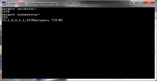 Делим числитель на знаменатель, запоминаем его целое значение (a div b, где а – числитель, b - знаменатель), находим остаток от деления числителя на знаменатель (a mod b), присваиваем числителю значение остатка, меняем местами числитель и знаменатель, и так делаем до тех пор, пока (a mod b) не станет равен нулю.