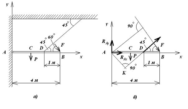 Задача 1. Горизонтальная продольная балка АВ длиной l = 4 м и весом P = 1 Т, прикрепленная шарниром А к стене, удерживается в равновесии тросом DE, расположенным под углом 45° к горизонту; DB = 1 м. К свободному концу балки В приложена сосредоточенная сила F = 2 Т, образующая угол 60° с горизонтом.