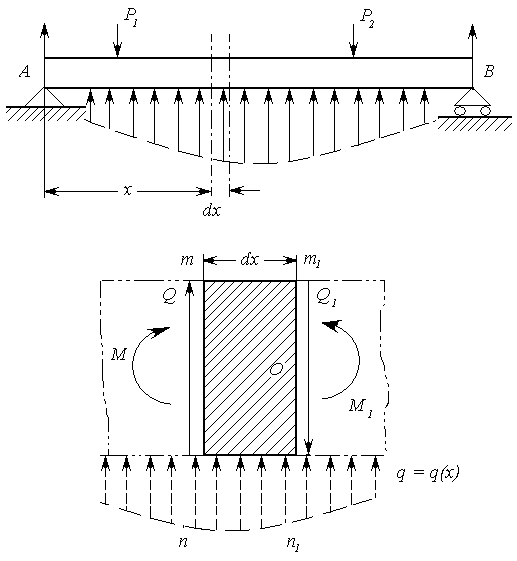 Поэтому, если из балки (рис.15) вырезать элемент бесконечно малой длины dx, то он должен находиться в равновесии под действием части сплошной нагрузки с интенсивностью q (которую на длине dx можно считать постоянной), а также сил Q и Q1 и моментов М и М1, заменяющих действие на него соответственно левой и правой отброшенных частей.