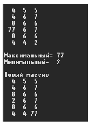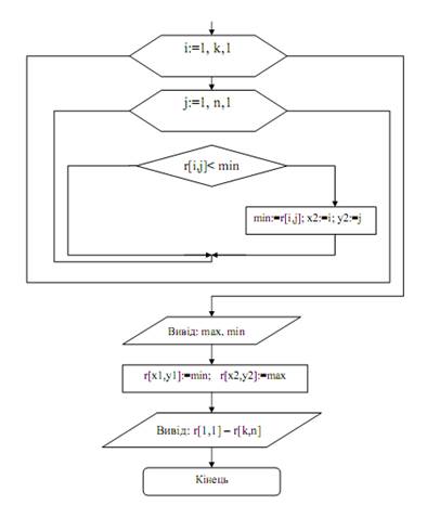 Знайти найбільший і найменший елементи матриці R(K,N), K<=20, N<=10 та поміняти їх місцями. Надрукувати матрицю R й одержану матрицю.