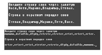Задано рядок, що містить від 1 до 30 слів, у кожному з яких від 1 до 5 прописних латинських літер, між сусідніми словами – кома, за останнім словом – крапка. Надрукувати цей же рядок слів, але в зворотньому порядку.