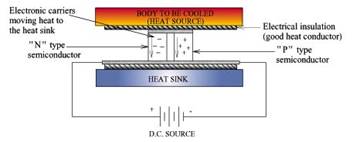 Есть и еще один любопытнейший интерфейс между чипом и радиатором, основанный на открытом еще в первой половине 19-го века эффекте, по имени его первооткрывателя получившего название эффекта Пельтье. Эффект заключается в том, что напряжение, поданное на два противоположных друг другу материала вызывает разницу температур. Перетекая в один, электроны переходят в более высокое энергетическое состояние, поглощая тепло, возвращаясь в другой, они это тепло высвобождают. Типичный термоэлектрический модуль, таким образом, состоит из двух хорошо пропускающих тепло керамических пластинок, являющихся его оболочкой, и расположенных между ними пар из прилегающих друг ко другу P и N легированных материалов полупроводника теллурида висмута (Рис.6).