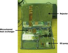 Или, к примеру, еще один похожий вариант. Но здесь к термодинамике добавляются еще и электрические силы. Есть такой эффект - электроосмос, когда внешнее электрическое поле перемещает ионы в жидкости, заставляя весь ее объем перемещаться в том же направлении. В результате у нас появляется возможность создания миниатюрного гидравлического насоса, не имеющего движущихся частей - вполне идеальный вариант для применения в PC классических систем с водным охлаждением. Ученые из Стэнфорда исследовали подобные системы в сочетании с радиаторами с внутренней капиллярной структурой, и достигли весьма обнадеживающих результатов, вполне позволяющих рекомендовать подобные комбинации, например, для использования в мощных ноутбуках (рис.12).