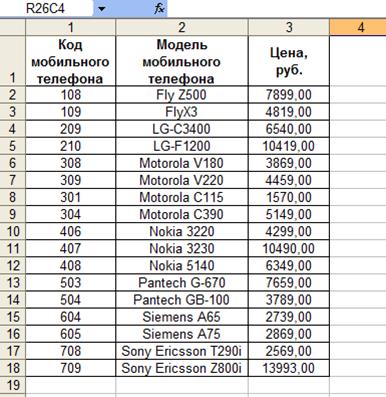 | Код мобильного телефона | Модель мобильного телефона | Цена, руб. |