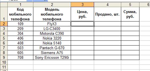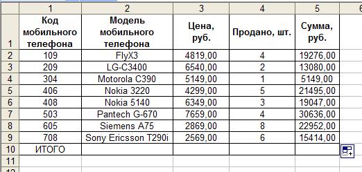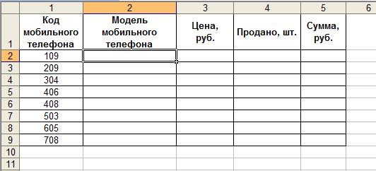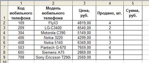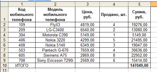 | Код мобильного телефона | Модель мобильного телефона | Цена, руб. | Продано, шт. | Сумма, руб. |