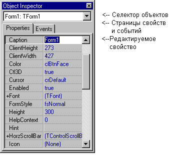 Якщо вибрати компонент із палітри та додати його до форми, інспектор об'єктів автоматично покаже властивості та події, які можуть бути використані з тім компонентом. У верхній частині інспектора об'єктів є список, що випадає, що дозволяє вибирати потрібний об'єкт із наявних на формі.
