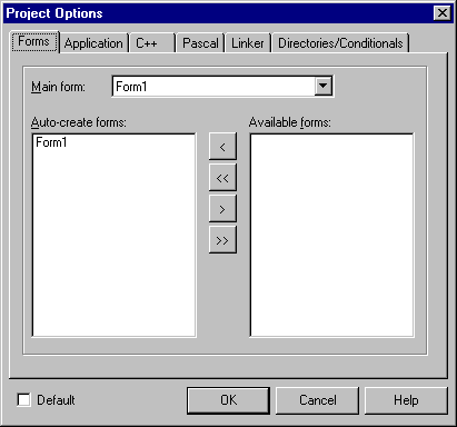 Якщо вибрати кнопку Options у менеджері проектів, відкриється діалогова панель опцій проекту, у якій можна вибрати головну форму проекту, визначити, які форми будуть створюватися динамічно, які параметри компіляції модулів (у тому числі створених в Delphi 2.0, тому що C++ Builder може включати їх у проекти) і компонування.