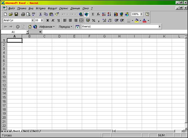 Окно Excel содержит множество различных элементов (см рис.1). Некоторые из них присущи всем программам в среде Windows, остальные имеются только в этом табличном редакторе. Вся рабочая область окна Excel занята чистым рабочим листом (или таблицей), разделённым на отдельные ячейки. Столбцы озаглавлены буквами, строки - цифрами.