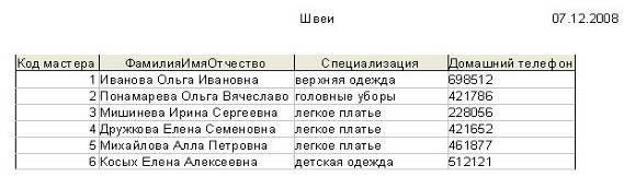 Рис. 14 Отчет – Список мастеров (по таблице Швеи)