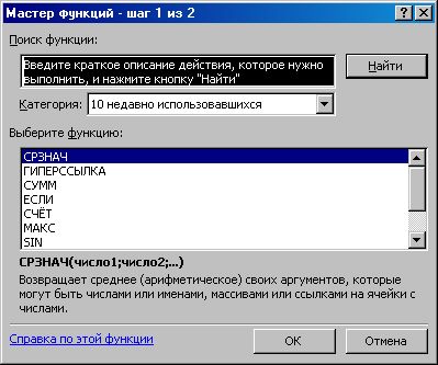 Для вычислений в таблице с помощью встроенных функций рекомендуется использовать мастер функций. Диалоговое окно мастера функций доступно при выборе команды Функция в меню Вставка или нажатии кнопки, на стандартной панели инструментов. В процессе диалога с мастером требуется задать аргументы выбранной функции, для этого необходимо заполнить поля в диалоговом окне соответствующими значениями или адресами ячеек таблицы.