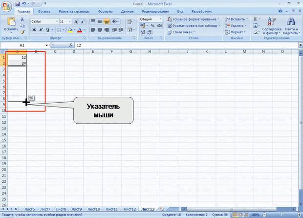 Во всех этих случаях автозаполнение происходит рядом данных со стандартным шагом. При необходимости заполнения рядом данных с произвольным шагом необходимо в две смежные ячейки ввести два первых значения, затем выделить обе ячейки и перетащить маркер автозаполнения (рис. 4.17) при нажатой левой кнопке мыши.