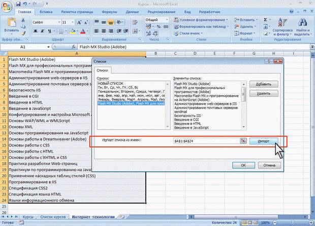 5. В окне Списки убедитесь, что ссылка на ячейки в выделенном списке элементов отображается в поле Импорт списка из ячеек, и нажмите кнопку Импорт (рис. 4.18). Элементы выделенного списка будут добавлены в поле Списки, а его элементы будут отображаться в поле Элементы списка.