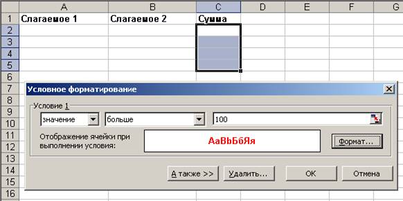 После задания условия нажмите кнопку "Формат". Откроется окно диалога "Формат ячеек", в котором можно выбрать шрифт, границы и другие атрибуты формата, который должен применяться при выполнении заданного условия.
