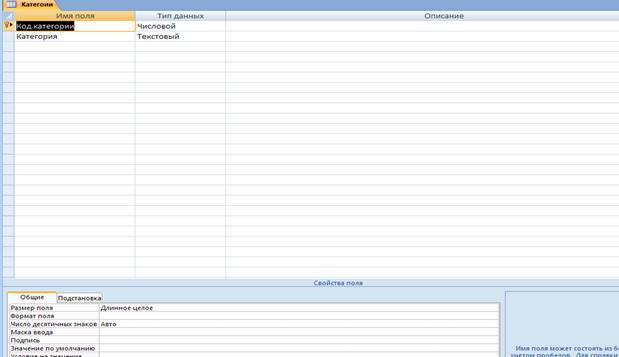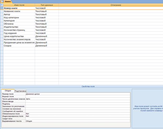 4. В каждой из таблиц намечают ключевое поле . В качестве такого выбирают поле, данные в котором повторяться не могут. Для таблицы данных о книгах таким поле может служить Номер книги . Для таблицы, в которой содержаться категории, - Код категории . Если в таблице вообще нет ни каких полей, которые можно было бы использовать, как ключевые, всегда можно ввести дополнительное поле типа Счетчик – оно не может содержать повторяющихся данных по определению.