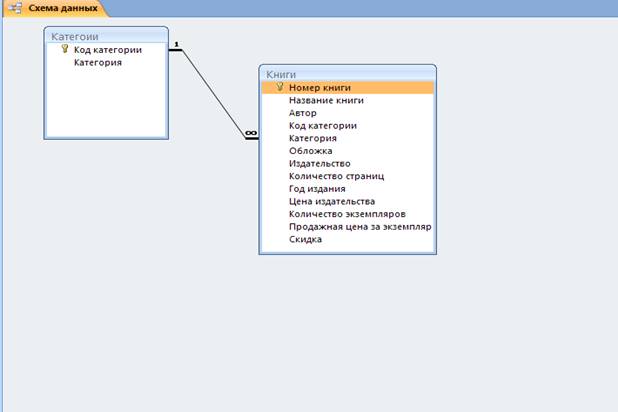 5. Далее определяются связи между таблицами(рис. 3). Такой чертеж называется схемой данных . Существует несколько типов возможных связей между таблицами. Наиболее распространенными являются связи «один ко многим» и «один к одному». Связь между таблицами организуется на основе общего поля, причем в одной из таблиц оно обязательно должно быть ключевым, то есть на стороне «один» должно выступать ключевое поле, содержащее уникальные, неповторяющиеся значения. Значения на стороне «многие» могут повторяться.