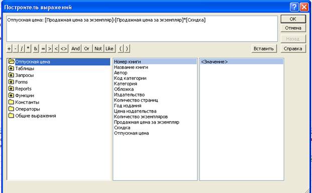 Создание запросов интересно не только тем, что вы можете в виде одной таблицы представить данные из нескольких связанных таблиц и отобрать нужные записи из этих таблиц. Вы можете создавать столбцы в запросе, которые являются результатом вычислений над значениями других столбцов. Такие столбцы называются вычисляемыми. Это существенно расширяет возможности запросов. Чтобы создать вычисляемое поле, нужно ввести выражение (рис.5), которое вычисляет требуемое значение, в строку Поле свободного столбца бланка запроса.(рис. 4)