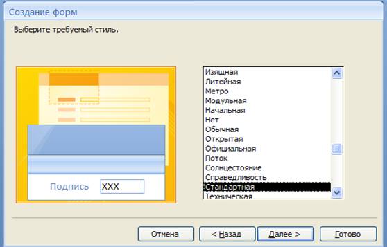 Самый легки способ создания формы с помощью Мастера форм. Выберите Формы / Создать. На экране появится окно диалога «Новая форма», в котором необходимо выбрать метод построения формы и исходный объект для построения формы. В качестве такого объекта могут быть выбраны таблица или запрос. Допустим в качестве исходной таблицы мы выбрали Запрос: Отпускная цена , далее выбираем поля для формы. После нажатия кнопки Далее , переходим к следующему диалоговому окну (рис. 6). На следующих шагах Мастер форм предлагает выбрать форму представления отчета (в столбец, ленточную, табличную или выровненную) и стиль оформления. Стили представляют собой набор различных фоновых рисунков с соответствующим подбором шрифтов и форм полей (рис. 7). На последнем шаге можно изменить предлагаемое Мастером название формы на свое собственное и на этом завершить процесс создания формы нажав кнопку Готово . Если по каким-либо причинам форма вас не удовлетворяет, нажмите кнопку Конструктор , и вы перейдете в режим конструктора форм, в котором получите в свое распоряжение все средства для создания полноценной формы.