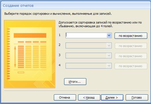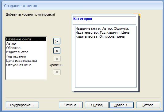 Отчеты, как и формы, являются главными элементами интерфейса баз данных. Они позволяют выводить на печать информацию о содержимом базы в удобном для пользователя виде. Большая часть отчетов создается на этапе проектирования офисного приложения.. Во многом формирование отчетов совпадает с процессом создания экранных форм. Пусть, например, мы создаем отчет с помощью Мастера для распечатки списка книг. В качестве исходных данных выберем запрос Отпускные цены. На следующем шаге Мастер отчетов предлагает осуществить группировку данных (рис. 9). На следующих шагах предлагаются выбрать макет отображения отчета и ориентацию листа бумаги, а также определить стиль заголовка и подножий. После чего Мастер отчетов предлагает ввести сортировку. Допускается сортировка записей в возрастающем или убывающем порядке, включающая до четырех полей (рис.10). На следующих шагах предлагаются выбрать макет отображения отчета и ориентацию листа бумаги, а также определить стиль заголовка и подножий. Задайте наименование отчета и нажмите кнопку Готово (рис. 11).