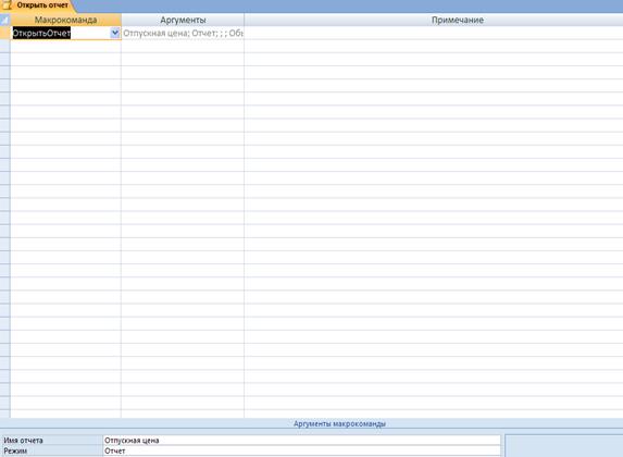· Откроется построитель макросов (рис. 12). В окне построителя макросов создается список макрокоманд, которые требуется выполнить при запуске макроса. При первом открытии построителя макросов будут отображены столбцы Макрокоманда, Аргументы и Примечание .