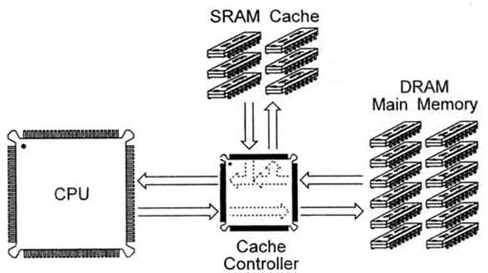 Между процессором и основной памятью DRAM предусматривается быстрый кэш SRAM. В нем хранятся часто требуемые данные, которые он способен передавать очень быстро. Процесс управляется кэш-контроллером, который может обеспечивать различные режимы записи - такие, как