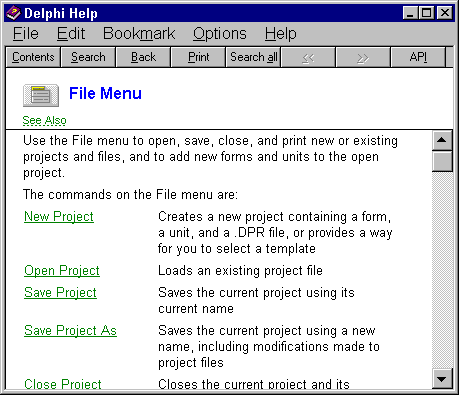 Как Вы увидите позже, большинство операций из пункта меню “File” можно выполнить с помощью Менеджера Проекта (Project Manager), который можно вызвать из пункта меню View. Некоторые операции доступны и через SpeedBar. Данная стратегия типична для Delphi: она предоставляет несколько путей для решения одной и той же задачи, Вы сами можете решать, какой из них более эффективен в данной ситуации.
