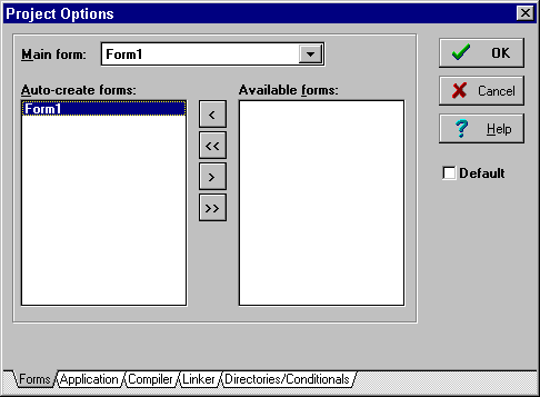 На странице Forms можно выбрать главную форму проекта. Изменения, которые Вы сделаете, отобразятся в соответствующем файле DPR. Например, в нижеследующем проекте, Form1 является главной, поскольку появляется первой в главном блоке программы: